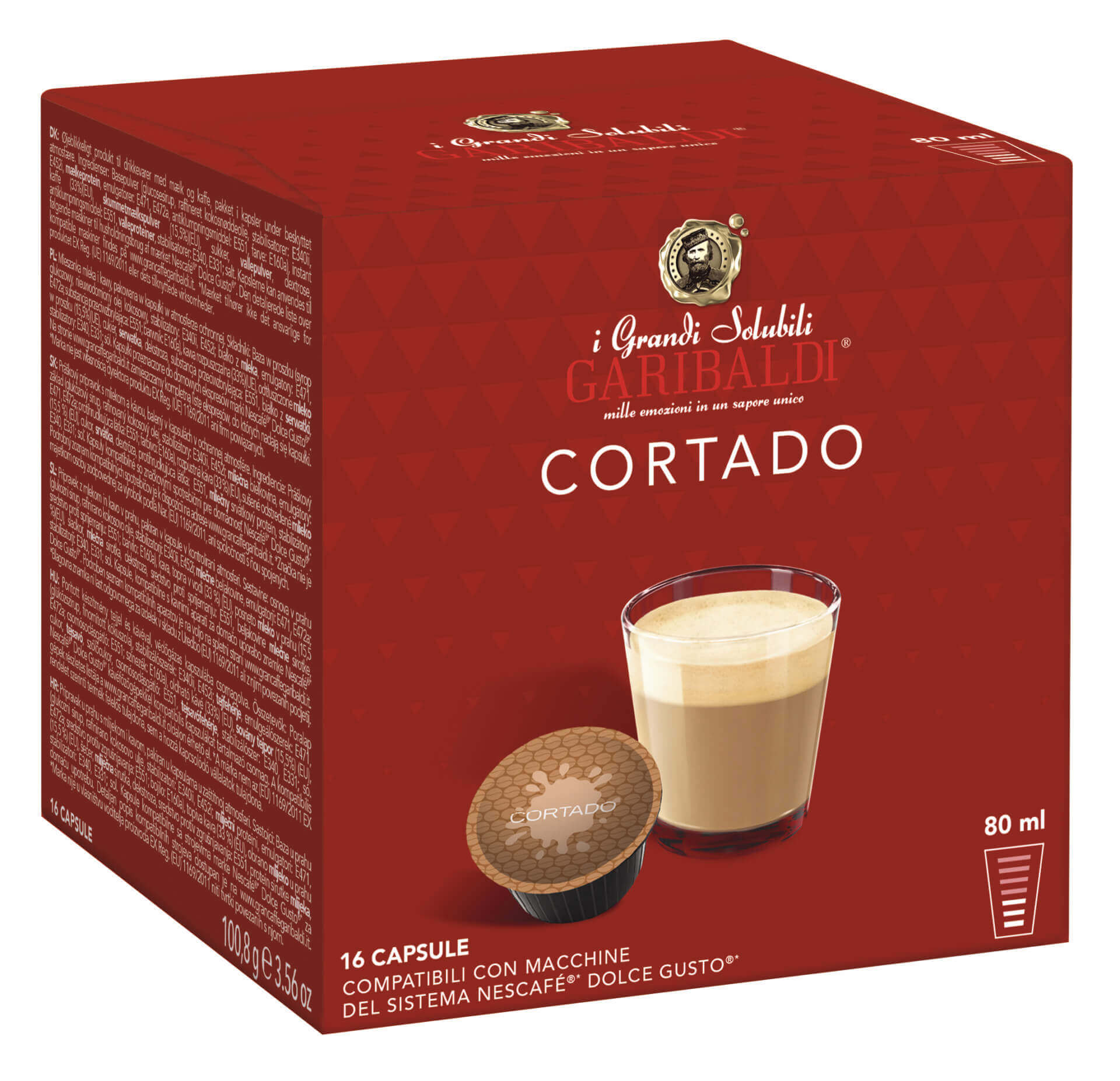 The box contains 16 capsules designed for NESCAFÉ® Dolce Gusto® capsule coffee machines to make 16 cups of GARIBALDI Cortado coffee. The coffee is packed in special hermetic capsules. In this way, the coffee retains its characteristic properties even after many months.