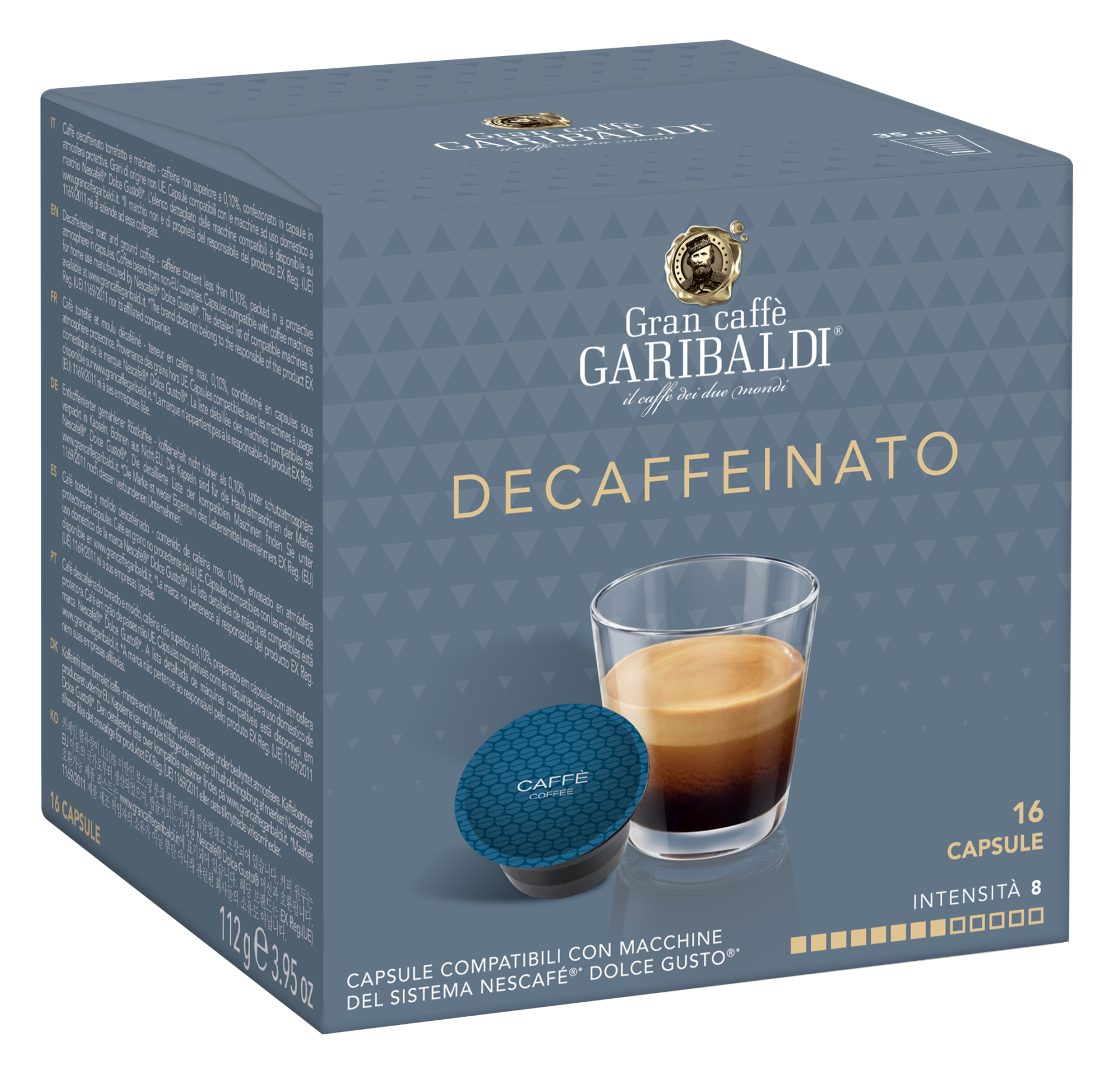 The box contains 16 capsules designed for NESCAFÉ® Dolce Gusto® capsule coffee machines to make 16 cups of GARIBALDI Decaffeinato coffee. The coffee is packed in special hermetic capsules. In this way, the coffee retains its characteristic properties even after many months.